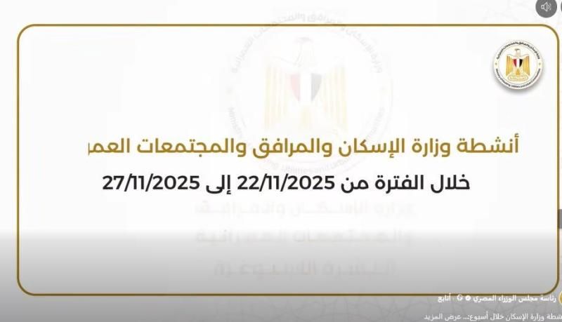 نشرت الصفحات الرسمية لوزارة الإسكان والمرافق والمجتمعات العمرانية على مواقع التواصل الاجتماعي، تقريراً بالفيديوجراف عن أنشطة الوزارة خلال الفترة من 22/11/2025 إلى 27/11/2025.