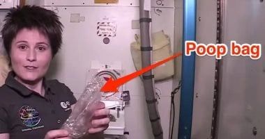كما يضع رواد الفضاء ورق التواليت والمناديل والقفازات، فالقفازات تساعد فى الحفاظ على نظافة كل شيء، فى الحاويات أيضًا، ثم تُحمل الحاويات في سفينة شحن تحمل الإمدادات إلى محطة الفضاء، وتُطلق هذه السفينة نحو الأرض وتحترق في الغلاف الجوى العلوى للأرض، وإذا سبق لك أن رأيت شهابًا، فربما لم يكن نيزكًا يحترق في الغلاف الجوي للأرض، بل ببساطة ربما كان براز رواد فضاء مشتعلًا.