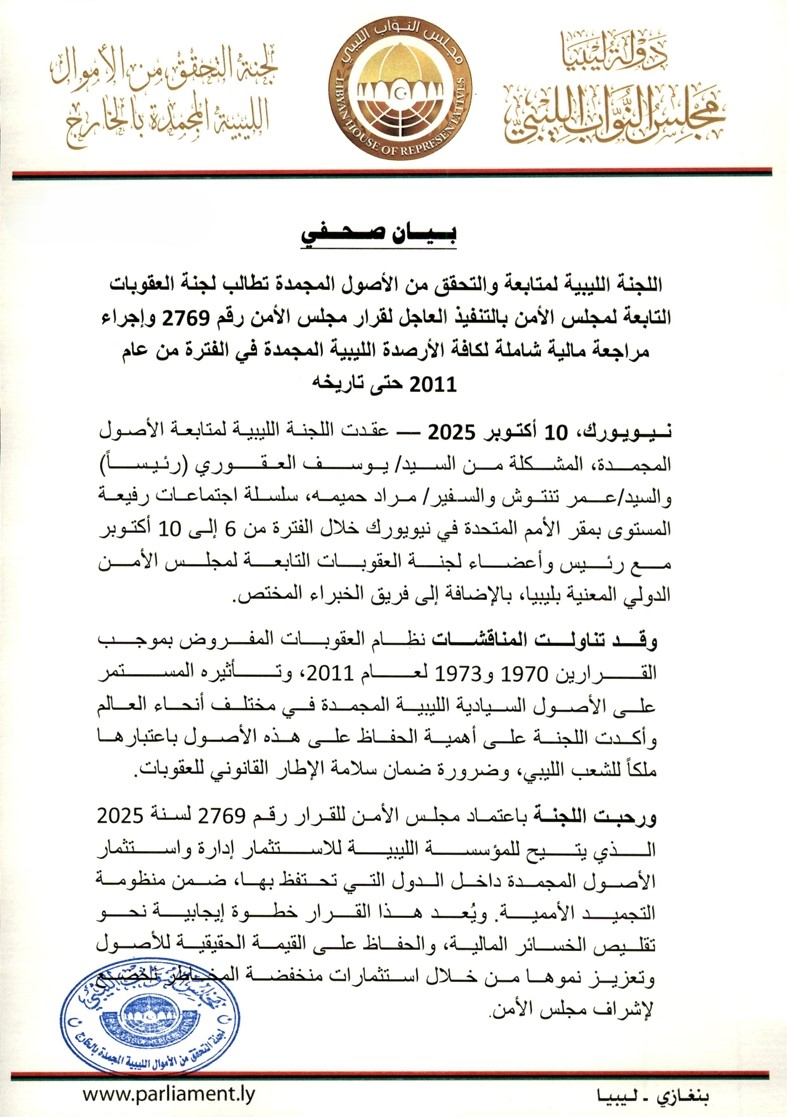ليبيا – طالبت اللجنة الليبية لمتابعة الأصول المجمدة النيابية لجنة العقوبات التابعة لمجلس الأمن الدولي بالتنفيذ العاجل للقرار رقم 2769 لسنة 2025، مؤكدة ضرورة إجراء مراجعة مالية شاملة للأرصدة الليبية المجمدة منذ عام 2011 وحتى اليوم.