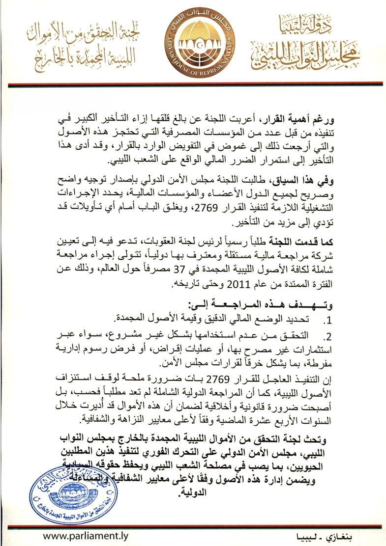 دعت اللجنة إلى تعيين شركة مراجعة مالية مستقلة ومعترف بها دوليًا للتحقق من القيمة الفعلية للأرصدة وضمان عدم استخدامها بشكل غير قانوني، مشددة على أن المراجعة الدولية الشاملة «ضرورة قانونية وأخلاقية» لإدارة الأصول وفق أعلى معايير الشفافية حمايةً لحقوق الليبيين.