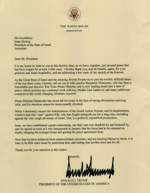 وكتب ترامب في الرسالة: “أدعوكم إلى منح عفو كامل لبنيامين نتنياهو، فلا ينبغي أن يتشتت انتباهه بلا داع. أؤمن بأن القضية المرفوعة ضده، وهو الذي وقف إلى جانبي طويلا، قضية سياسية وغير مبررة”.