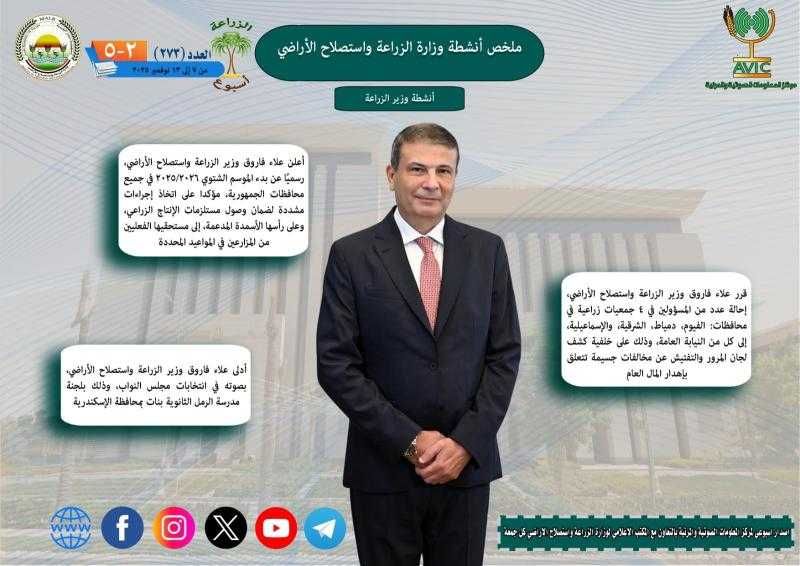 وقرر وزير الزراعة واستصلاح الأراضي، إحالة عدد من المسؤولين في 4 جمعيات زراعية في محافظات: الفيوم، دمياط، الشرقية، والإسماعيلية، إلى كل من النيابة العامة، وذلك على خلفية كشف لجان المرور والتفتيش عن مخالفات جسيمة تتعلق بإهدار المال العام، كما أعلن رسميًا عن بدء الموسم الشتوي 2026/2025 في جميع محافظات الجمهورية، مؤكدا على اتخاذ إجراءات مشددة لضمان وصول مستلزمات الإنتاج الزراعي، وعلى رأسها الأسمدة المدعمة، إلى مستحقيها الفعليين من المزارعين في المواعيد المحددة