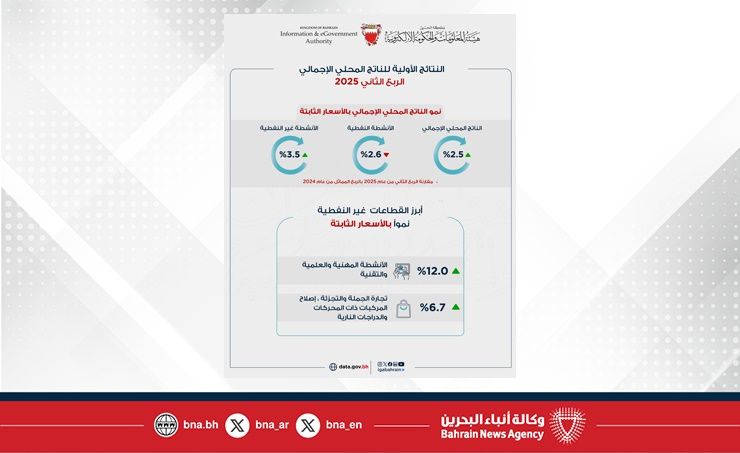 المنامة في 07 أكتوبر/ بنا / أعلنت هيئة المعلومات والحكومة الإلكترونية عن التقديرات الأولية للناتج المحلي الإجمالي للربع الثاني من عام 2025. حيث سجل الاقتصاد البحريني نمواً بنسبة 2.5% و2.3% بالأسعار الثابتة والجارية على التوالي على أساس سنوي.
