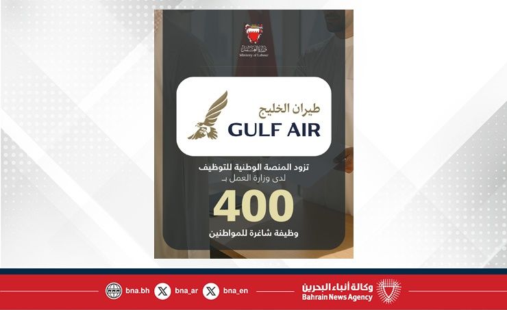 المنامة في 13 أكتوبر/ بنا / في إطار مواصلة الجهود الوطنية الرامية إلى توفير فرص عمل نوعية للمواطنين وتمكينهم من الإسهام الفاعل في مسيرة التنمية، أعلن سعادة السيد يوسف بن عبدالحسين خلف وزير الشؤون القانونية وزير العمل بالوكالة أن طيران الخليج قامت بتزويد المنصة الوطنية للتوظيف التابعة لوزارة العمل بـ 400 وظيفة شاغرة مخصصة للمواطنين.