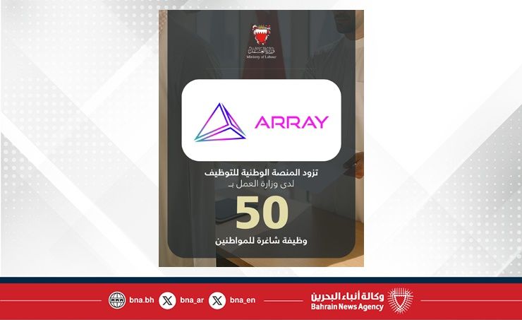 المنامة في 13 أكتوبر / بنا / في إطار مواصلة الجهود الوطنية الرامية إلى توفير فرص عمل نوعية للمواطنين وتمكينهم من الإسهام الفاعل في مسيرة التنمية، أعلن سعادة السيد يوسف بن عبدالحسين خلف وزير الشؤون القانونية وزير العمل بالوكالة أن شركة ARRAY قامت بتزويد المنصة الوطنية للتوظيف التابعة لوزارة العمل بـ 50 وظيفة شاغرة مخصصة للمواطنين.