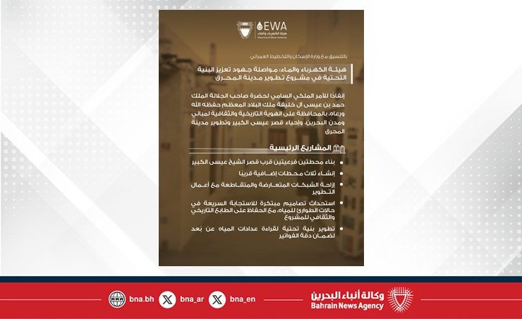 المنامة في 16 أكتوبر/ بنا / إنفاذًا للأمر الملكي السامي لحضرة صاحب الجلالة الملك حمد بن عيسى آل خليفة ملك البلاد المعظم حفظه الله ورعاه، بالمحافظة على الهوية التاريخية والثقافية لمباني ومدن البحرين، وإحياء قصر عيسى الكبير وتطوير مدينة المحرق بما يحفظ هويتها التاريخية والثقافية، وتنفيذًا لتوجيهات صاحب السمو الملكي الأمير سلمان بن حمد آل خليفة ولي العهد رئيس مجلس الوزراء بتفعيل الخطة التنفيذية الخاصة بالمحافظة على الهوية التاريخية والثقافية لمباني ومدن البحرين وإطلاق خطة تطوير مدينة المحرق، أكدت هيئة الكهرباء والماء أن فرقها المتخصصة تعمل ضمن إطار تكاملي مع وزارة الإسكان والتخطيط العمراني والجهات الحكومية الأخرى، لتلبية احتياجات مشروع تطوير مدينة المحرق وتوفير الحلول الفنية اللازمة، بما يضمن إنجاز المراحل التنفيذية وفق الجدول الزمني والمعايير المعتمدة.