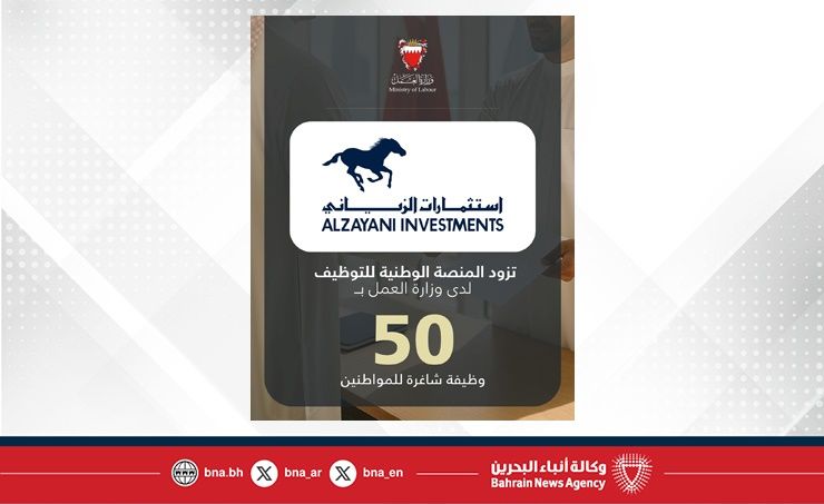 المنامة في 16 أكتوبر/ بنا / في إطار تنفيذ توجيهات صاحب السمو الملكي الأمير سلمان بن حمد آل خليفة، ولي العهد رئيس مجلس الوزراء، حفظه الله، بعرض ثلاث فرص وظيفية لكل باحث عن عمل مسجل لدى وزارة العمل، قامت مجموعة استثمارات الزياني بتزويد المنصة الوطنية للتوظيف بـ 50 وظيفة شاغرة للمواطنين.