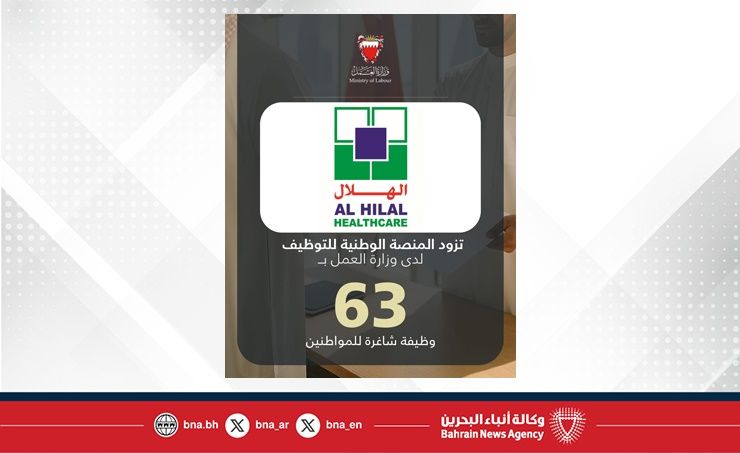 المنامة في 20 أكتوبر/ بنا / في إطار تنفيذ توجيهات صاحب السمو الملكي الأمير سلمان بن حمد آل خليفة ولي العهد رئيس مجلس الوزراء حفظه الله، بعرض 3 فرص وظيفية لكل باحث عن عمل مسجل لدى وزارة العمل، شركة مستشفى الهلال تزود المنصة الوطنية للتوظيف بـ 63 وظيفة شاغرة للمواطنين.
