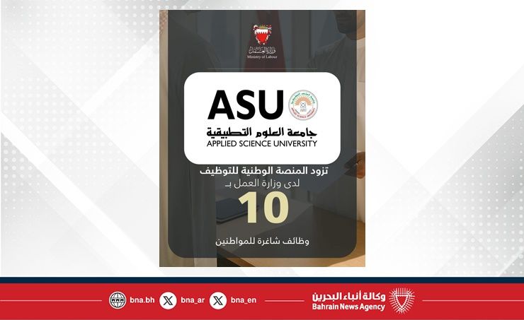 المنامة في 05 نوفمبر / بنا / في إطار تنفيذ توجيهات صاحب السمو الملكي الأمير سلمان بن حمد آل خليفة ولي العهد رئيس مجلس الوزراء حفظه الله، بعرض 3 فرص وظيفية لكل باحث عن عمل مسجل لدى وزارة العمل، جامعة العلوم التطبيقية تزود المنصة الوطنية للتوظيف بـ 10 وظائف شاغرة للمواطنين.