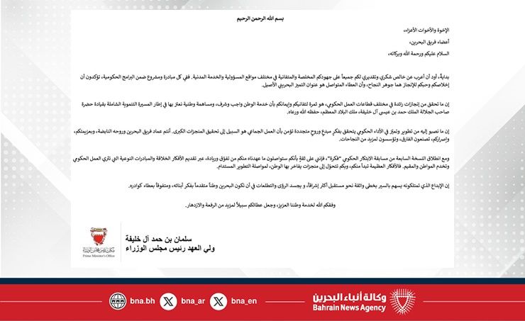 إن ما نصبو إليه من تطوير وتميّز في الأداء الحكومي يتحقق بفكرٍ مبدعٍ وروحٍ متجددة تؤمن بأن العمل الجماعي هو السبيل إلى تحقيق المنجزات الكبرى. أنتم عماد فريق البحرين وروحه النابضة، وبعزيمتكم، وإصراركم، تصنعون الفارق، وتؤسسون لمزيد من النجاحات.
