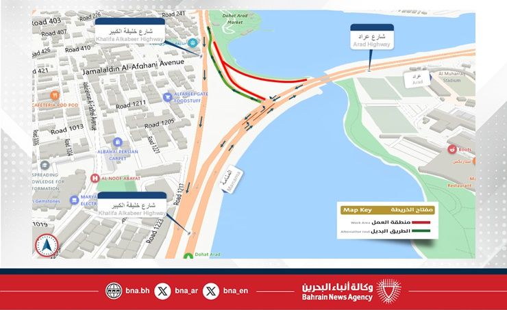 المنامة في 20 نوفمبر/ بنا / أعلنت وزارة الأشغال وبالتنسيق مع الإدارة العامة للمرور بوزارة الداخلية، بأن أعمال مشروع تطوير الطرق المؤدية لمطار البحرين الدولي تستدعي غلق بعض المسارات حسب التفاصيل التالية: