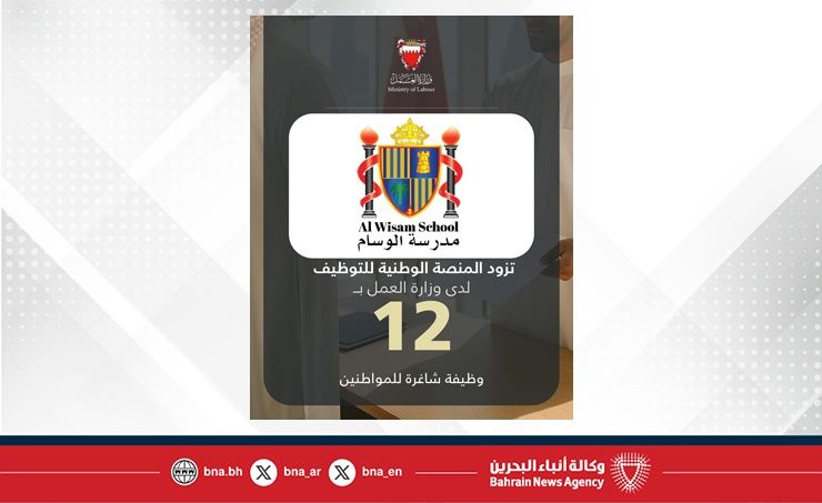 المنامة في 25 نوفمبر/ بنا / في إطار تنفيذ توجيهات صاحب السمو الملكي الأمير سلمان بن حمد آل خليفة ولي العهد رئيس مجلس الوزراء حفظه الله، بعرض 3 فرص وظيفية لكل باحث عن عمل مسجل لدى وزارة العمل، مدرسة الوسام تزود المنصة الوطنية للتوظيف بـ 12 وظيفة شاغرة للمواطنين.