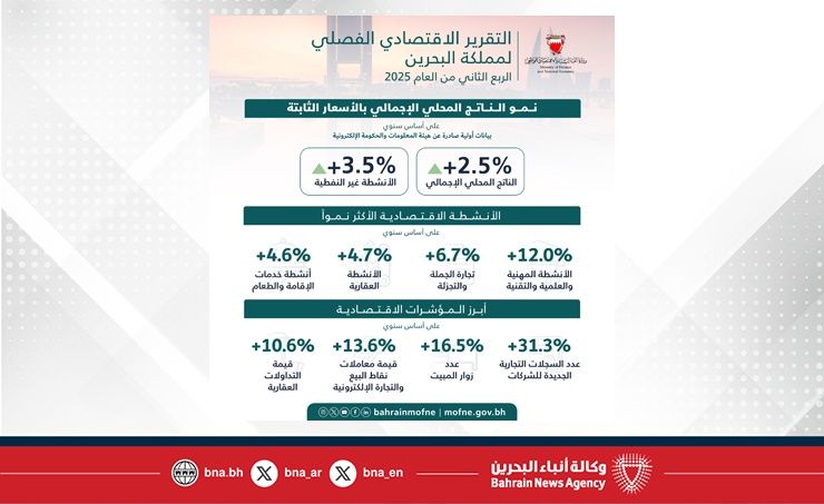 المنامة في 06 أكتوبر/ بنا / نشرت وزارة المالية والاقتصاد الوطني اليوم التقرير الاقتصادي الفصلي لمملكة البحرين للربع الثاني من عام 2025 عبر موقعها الإلكتروني www.mofne.gov.bh.