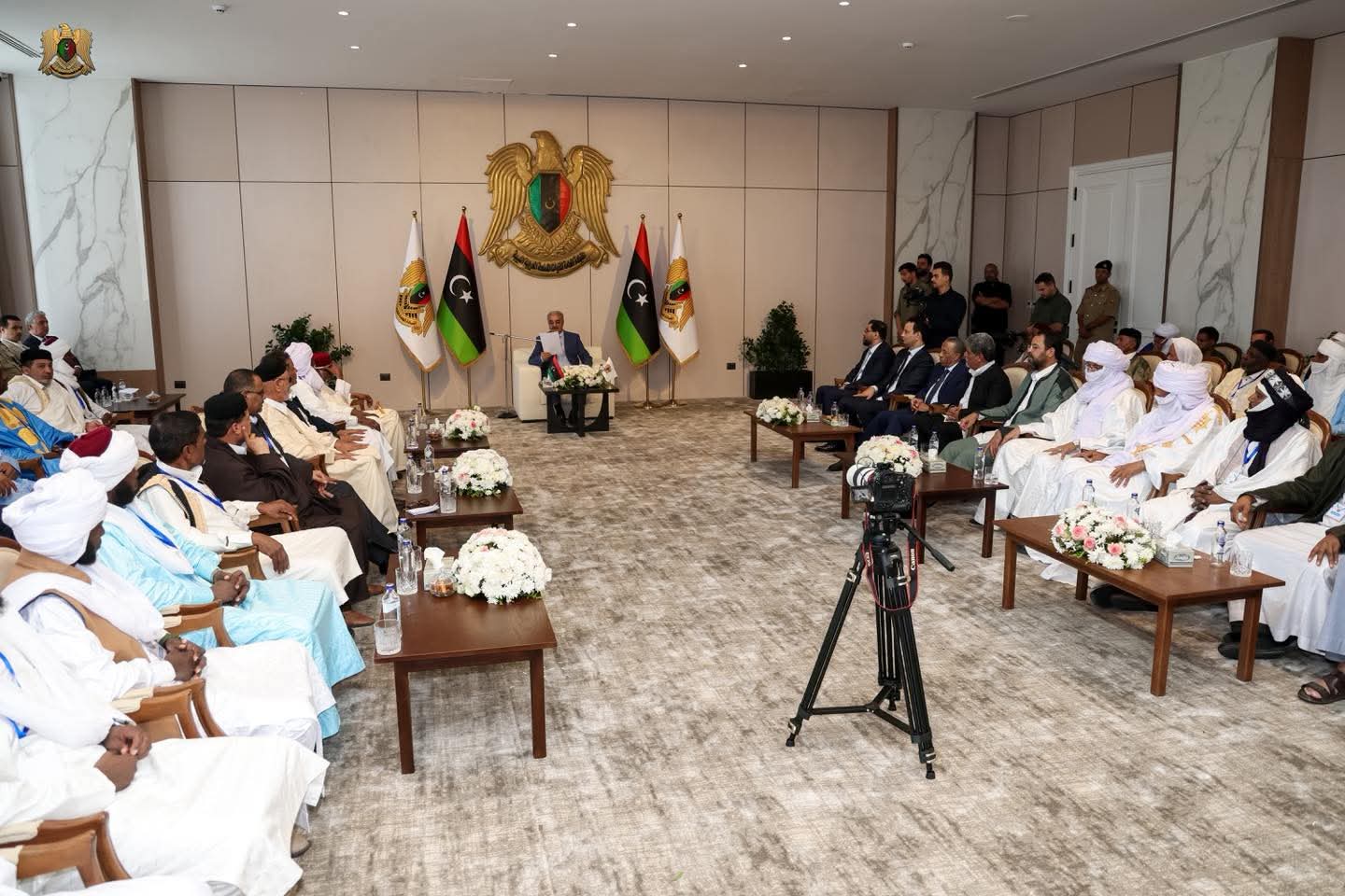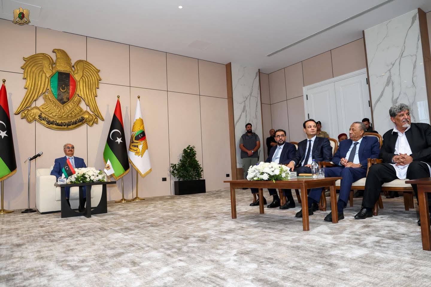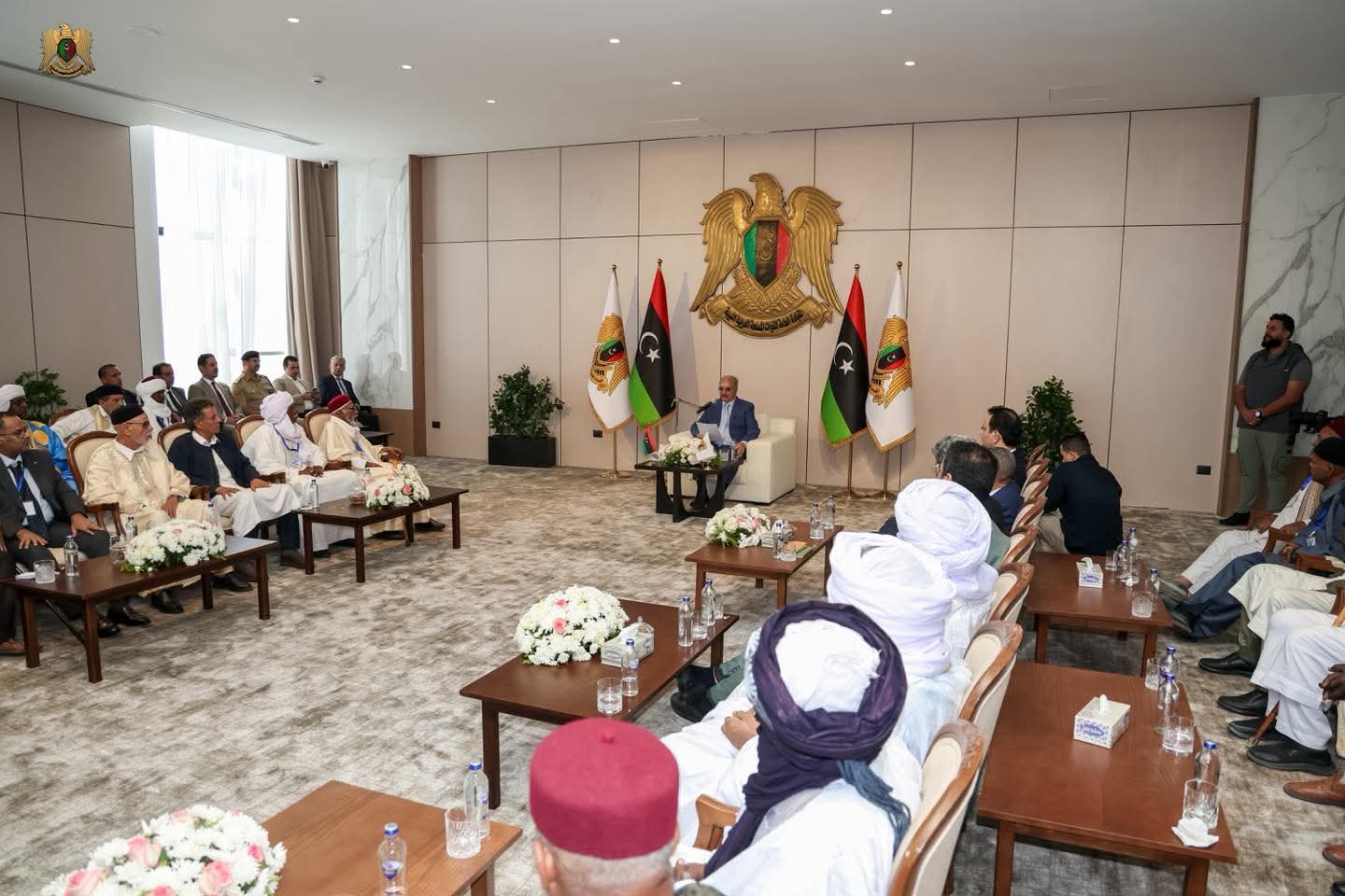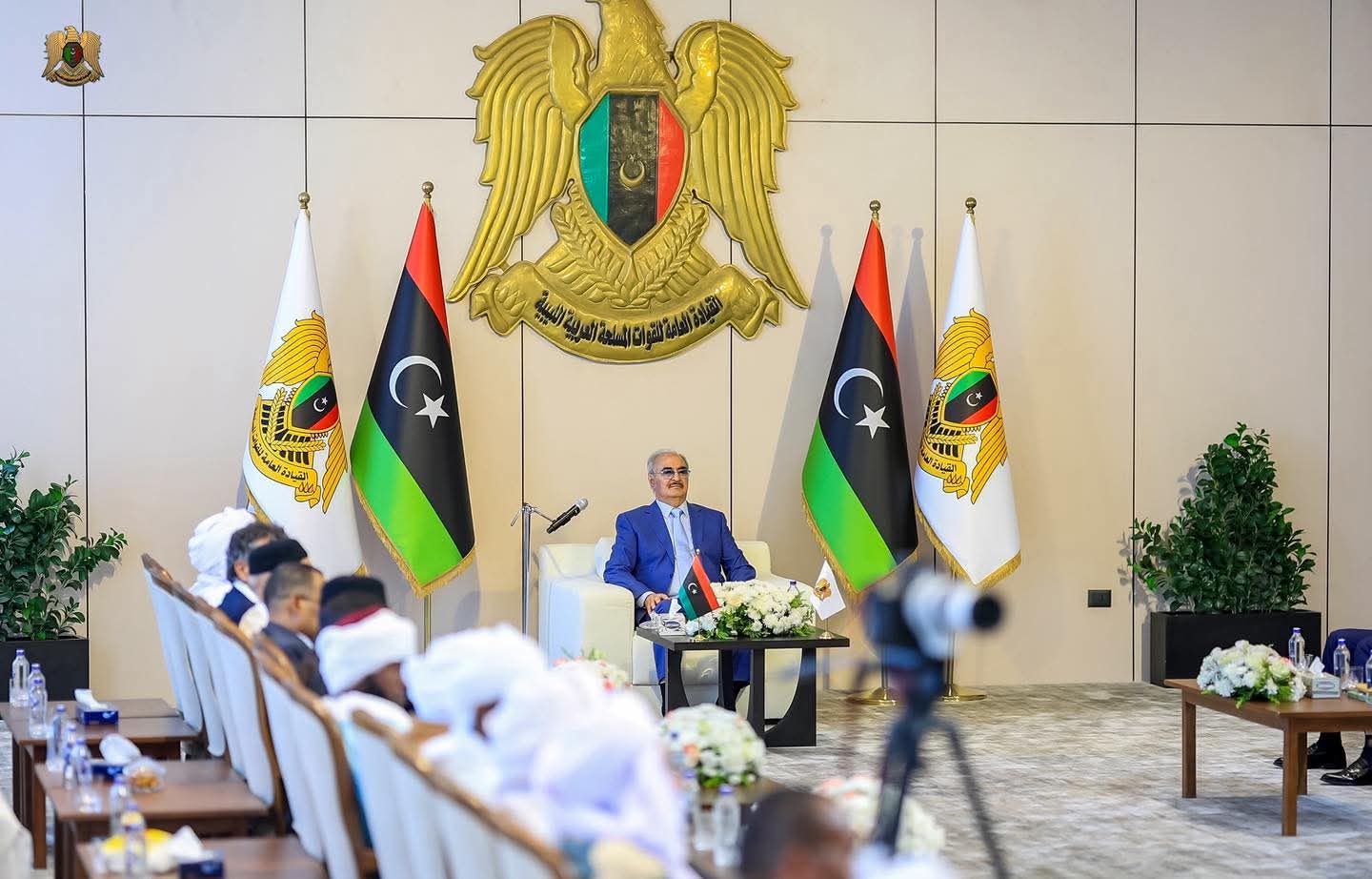 ليبيا – استقبل القائد العام للقوات المسلحة، المشير خليفة حفتر، مشايخ وأعيان وحكماء قبائل فزّان في مدينة المشير خليفة حفتر العسكرية، بحضور رئيس حكومة الاستقرار أسامة حماد، ورئيس الأركان العامة الفريق أول ركن خالد حفتر، ومدير عام صندوق التنمية وإعادة إعمار ليبيا بالقاسم حفتر.