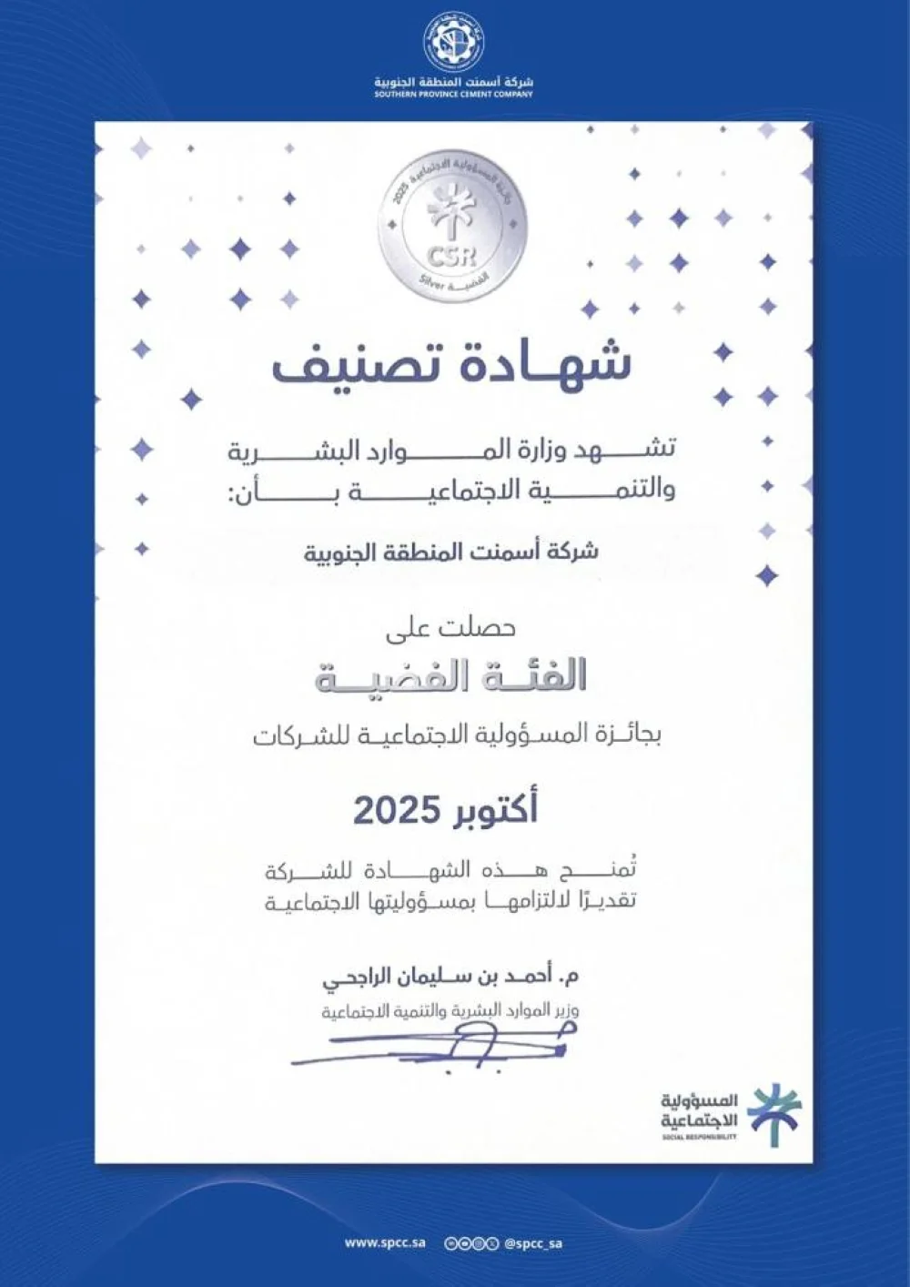 وأوضح الرئيس التنفيذي المكلف لشركة أسمنت المنطقة الجنوبية المهندس سعود بن سفر آل برقان أن هذا التقدير يأتي تتويجًا لثقافة العمل المؤسسي وروح الفريق الواحد التي تتميز بها الشركة، مؤكدًا أن “أسمنت المنطقة الجنوبية تفخر بدورها كشريك فاعل في التنمية الوطنية، وتسعى دائمًا إلى أن تكون نموذجًا في الممارسات المسؤولة والمبادرات التي تلامس احتياجات المجتمع”.
