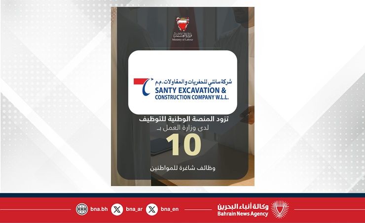 المنامة في 03 نوفمبر/ بنا / في إطار تنفيذ توجيهات صاحب السمو الملكي الأمير سلمان بن حمد آل خليفة ولي العهد رئيس مجلس الوزراء حفظه الله، بعرض 3 فرص وظيفية لكل باحث عن عمل مسجل لدى وزارة العمل، شركة سانتي للحفريات والمقاولات تزود المنصة الوطنية للتوظيف بـ 10 وظائف شاغرة للمواطنين.